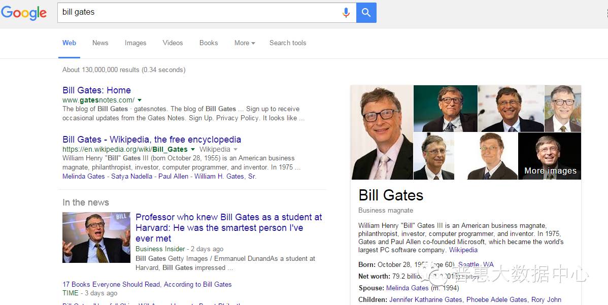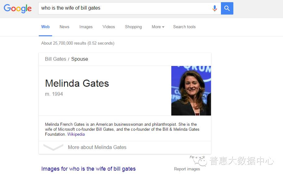 另外,对于稍微复杂的搜索语句比如 ”Who is the wife of Bill Gates“,Google能准确返回他的妻子Melinda Gates。这就说明搜索引擎通过知识图谱真正理解了用户的意图。