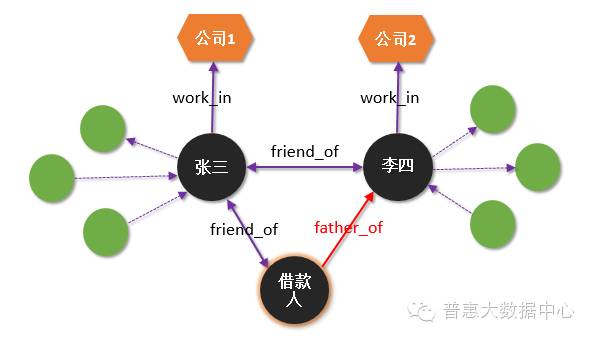 现实中,不少借款人在借款成功后出现不还款现象,而且玩“捉迷藏”,联系不上本人。即便试图去联系借款人曾经提供过的其他联系人,但还是没有办法联系到本人。这就进入了所谓的“失联”状态,使得催收人员也无从下手。那接下来的问题是,在失联的情况下,我们有没有办法去挖掘跟借款人有关系的新的联系人? 而且这部分人群并没有以关联联系人的身份出现在我们的知识图谱里。如果我们能够挖掘出更多潜在的新的联系人,就会大大地提高催收成功率。举个例子,在下面的关系图中,借款人跟李四有直接的关系,但我们却联系不上李四。那有没有可能通过2度关系的分析,预测并判断哪些李四的联系人可能会认识借款人。这就涉及到图谱结构的分析。
