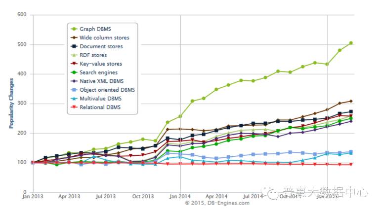 知识图谱是基于图的数据结构,它的存储方式主要有两种形式:RDF存储格式和图数据库(Graph Database)。至于它们有哪些区别,请参考【1】。下面的曲线表示各种数据存储类型在最近几年的发展情况。从这里我们可以明显地看到基于图的存储方式在整个数据库存储领域的飞速发展。这幅曲线图来源于 http://db-engines.com/en/blog_post//43