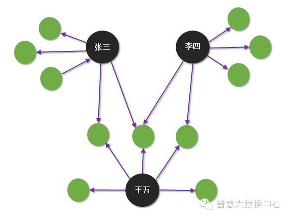 相比虚假身份的识别,组团欺诈的挖掘难度更大。这种组织在非常复杂的关系网络里隐藏着,不容易被发现。当我们只有把其中隐含的关系网络梳理清楚,才有可能去分析并发现其中潜在的风险。知识图谱,作为天然的关系网络的分析工具,可以帮助我们更容易地去识别这种潜在的风险。举一个简单的例子,有些组团欺诈的成员会用虚假的身份去申请贷款,但部分信息是共享的。下面的图大概说明了这种情形。从图中可以看出张三、李四和王五之间没有直接的关系,但通过关系网络我们很容易看出这三者之间都共享着某一部分信息,这就让我们马上联想到欺诈风险。虽然组团欺诈的形式众多,但有一点值得肯定的是知识图谱一定会比其他任何的工具提供更佳便捷的分析手段。