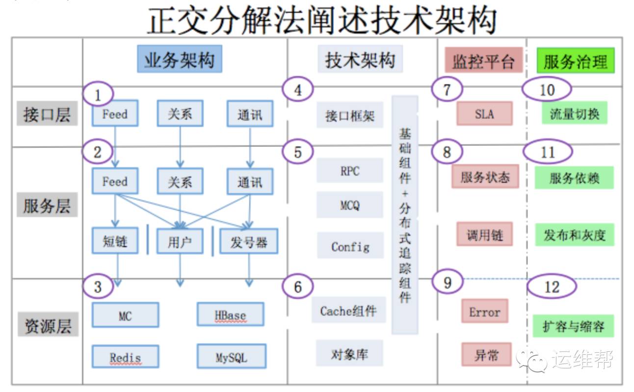 下面看一下第三代的架构图以及我们怎么用正交分 解法阐述。 我们可以看到我们从两个维度,横轴和纵轴可 以看到。一个维度是水平的分层拆分,第二从垂直的维 度会做拆分。水平的维度从接口层、到服务层到数据存储 层。垂直怎么拆分,会用业务架构、技术架构、监控平台、 服务治理等等来处理。我相信到第二代的时候很多架构已 经有了业务架构和技术架构的拆分。我们看一下,接口层 有feed、用户关系、通讯接口;服务层,SOA里有基层服务、 原子服务和组合服务,在微博我们只有原子服务和组合服 务。原子服务不依赖于任何其他服务,组合服务由几个原 子服务和自己的业务逻辑构建而成 ,资源层负责海量数据 的存储(后面例子会详细讲)。