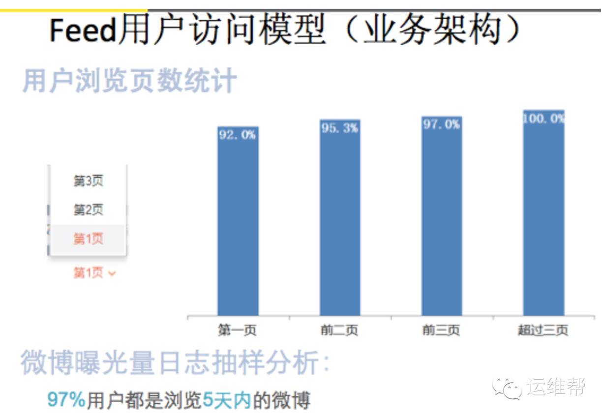 接下来我们看一下微博的Feed多级缓存。我们做业务的时候,经常很少做业务分析,技术大会上的分享又都偏向技术架构。其实大家更多的日常工作是需要花费更多时间在业务优化上。这张图是统计微博的信息流前几页的访 问比例,像前三页占了97%,在做缓存设计的时候,我们最 多只存最近的M条数据。 这里强调的就是做系统设计要基 于用户的场景,越细致越好。举了一个例子,大家都会 用电商,电商在双十一会做全国范围内的活动,他们做设 计的时候也会考虑场景的,一个就是购物车,我曾经跟相 关开发讨论过,购物车是在双十一之前用户的访问量非常 大,就是不停地往里加商品。在真正到双十一那天他不会 往购物车加东西了,但是他会频繁的浏览购物车。针对这 个场景,活动之前重点设计优化购物车的写场景, 活动开 始后优化购物车的读场景。