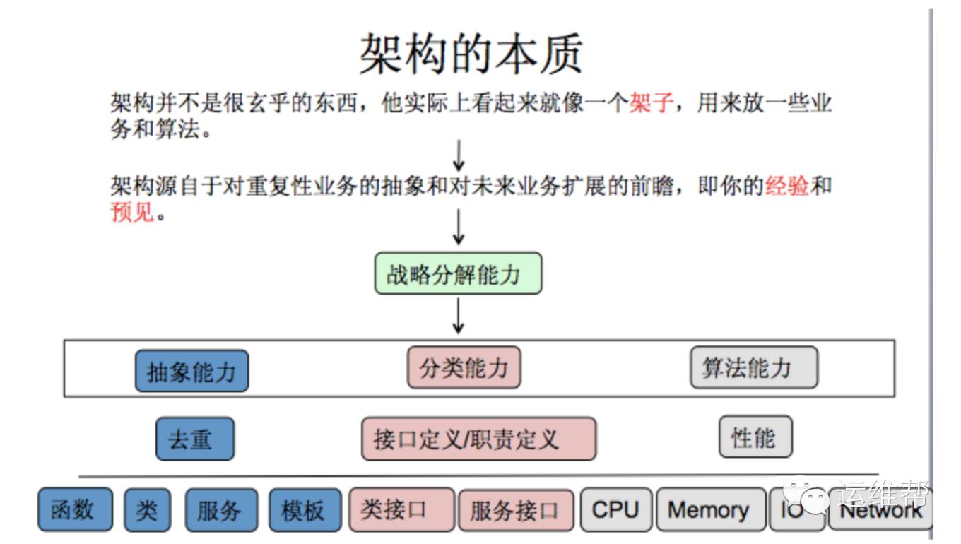 我们要想做一个架构的话需要哪些能力?我觉得最重要的是架构师一个最重要的能力就是你要有战略分解能力。 这个怎么来看呢,第一,你必须要有抽象的能力,抽象的能力最基本就是去重,去重在整个架构中体现在方方面面,从定义一个函数,到定义一个类,到提供的一个服务,以及模板,背后都是要去重提高可复用率。第二,分类能力。 做软件需要做对象的解耦,要定义对象的属性和方法,做 分布式系统的时候要做服务的拆分和模块化,要定义服务 的接口和规范。 第三,算法(性能),它的价值体现在提升系统的性能,所有性能的提升,最终都会落到CPU、内 存、IO和网络这4大块上。