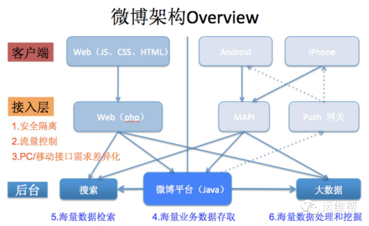 接下我们看一下微博整体架构,到一定量级的系统整个架构都会变成三层,客户端包括WEB、安卓和IOS,这里就不说了。接着还都会有一个接口层,有三个主要作用: