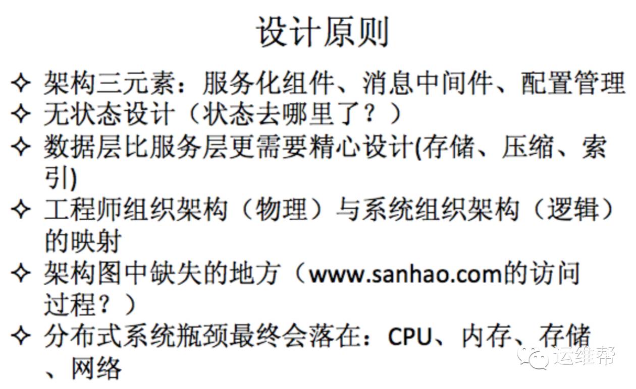 第六,我们说分布式系统,它最终的瓶颈会落在哪里 呢?前端时间有一个网友跟我讨论的时候,说他们的系统遇到了一个瓶颈, 查遍了CPU,内存,网络,存储,都没有问题。我说你再查一遍,因为最终你不论用上千台服务器还是上万台服务器,最终系统出瓶颈的一定会落在某一 台机(可能是叶子节点也可能是核心的节点),一定落在 CPU、内存、存储和网络上,最后查出来问题出在一台服务 器的网卡带宽上。