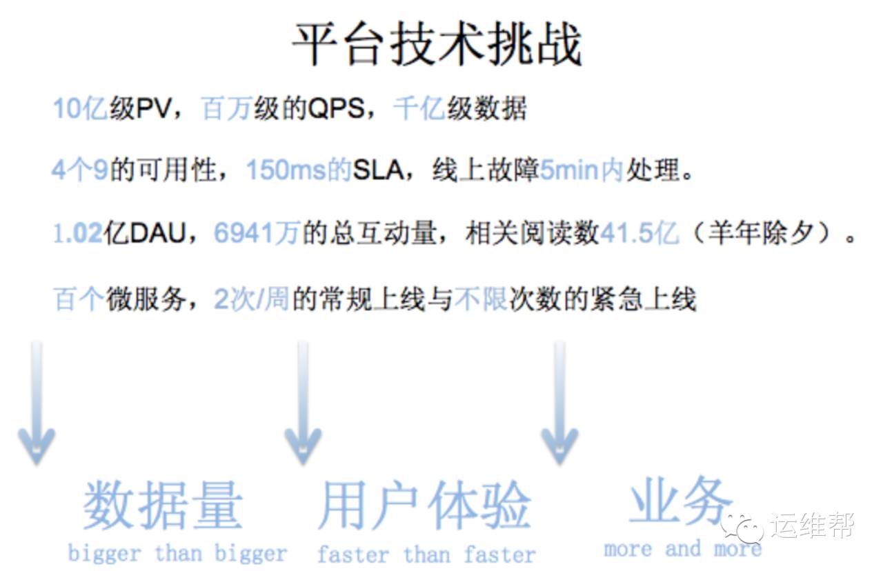 我们通过通过数据看一下它的挑战,PV是在10亿级别, QPS在百万,数据量在千亿级别。我们可用性,就是SLA要求4个9,接口响应最多不能超过150毫秒,线上所有的故障必须得在5分钟内解决完。如果说5分钟没处理呢?那会影 响你年终的绩效考核。2015年微博DAU已经过亿。我们系统有上百个微服务,每周会有两次的常规上线和不限次数的紧急上线。我们的挑战都一样,就是数据量,bigger and bigger,用户体验是faster and faster,业务是more and more。互联网业务更多是产品体验驱动,技术在产品体验 上最有效的贡献,就是你的性能越来越好。每次降低加载一个页面的时间,都可以间接的降低这个页面上用户的流失率。