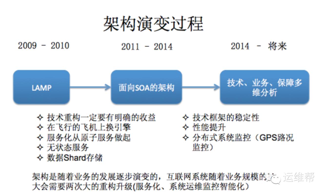 从LAMP的架构到面向服务的架构,有几个地方是非 常难的,首先不可能在第一代基础上通过简单的修修补补 满足用户量快速增长的,同时线上业务又不能停, 这是我们常说的在飞机上换引擎的问题。前两天我有一个朋友问 我,说他在内部推行服务化的时候,把一个模块服务化做完了,其他部门就是不接。我建议在做服务化的时候,首先更多是偏向业务的梳理,同时要找准一个很好的切入点, 既有架构和服务化上的提升,业务方也要有收益,比如提 升性能或者降低维护成本同时升级过程要平滑,建议开始 从原子化服务切入,比如基础的用户服务, 基础的短消息服务,基础的推送服务。 第二,就是可以做无状态服务, 后面会详细讲,还有数据量大了后需要做数据Sharding, 后面会将。第三代架构要解决的问题,就是用户量和业务 趋于稳步增加(相对爆发期的指数级增长),更多考虑技术框架的稳定性, 提升系统整体的性能,降低成本,还有对整个系统监控的完善和升级。