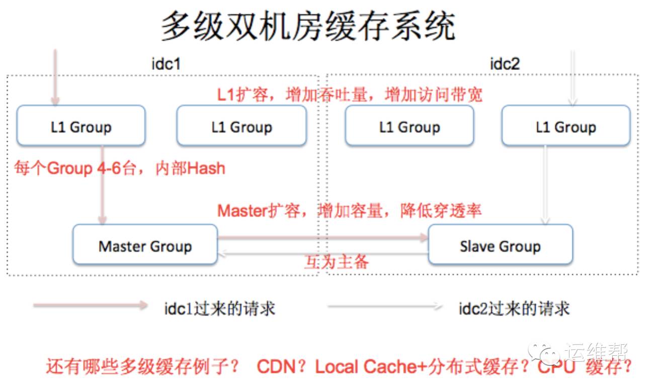 另外,我们看双机房的话,左边一个,右边一个。两个机房是互为主备,或者互为热备 。如果两个用户在不 同地域,他们访问两个不同机房的时候,假设用户从IDC1过来,因为就近原理,他会访问L1,没有的话才会跑到 Master,当在IDC1没找到的时候才会跑到IDC2来找。同时 有用户从IDC2访问,也会有请求从L1和Master返回或者到 IDC1去查找。 IDC1和IDC2,两个机房都有全量的用户 数据,同时在线提供服务,但是缓存查询又遵循最近 访问原理。