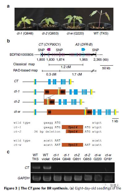 隐性突变基因ct造成的矮杆植株拥有深绿色、厚且皱巴巴的叶片和子叶,并且花和种子也非常小。在遗传图谱上定位到ct基因在LG5位置,与编码花青素合成基因A3的位点仅相距1.2 cM。因为油菜素甾醇(BR)能促使ct和kobito(kbt)共同突变,并且kbt与star(s)是等位基因,而s与拟南芥中编码BR合成酶的DET2基因是同源基因,因此作者推测矮基因CONTRACTED(CT)是一个BR合成基因。众所周知,拟南芥中的ROT3基因编码P450蛋白,可以催化BR前体中的C-23羟基化。而作者就在牵牛花名为BDFN01000805的scaffold中,距离A3基因129 kb的位置,找到了ROT3的同源基因,将其命名为INIL05g09538,进一步证明了作者的推测。通过比较发现,在矮植株中杆19个ct突变基因的第一个外显子都有Tpn1转座子插入,但在正常植株中都没有该插入。另外,在牵牛花中检测到了3个ct等位基因:ct-1,ct-2,ct-w。其中ct-1和ct-w带有Tpn1家族转座子Tpn14和Tpn15,而ct-2由ct-1缺失5’端包括Tpn14部分序列在内的36 bp序列产生。最后利用RT-PCR比较BR合成酶中突变基因的转录本水平发现,转座子的插入会强烈抑制植物下胚轴基因中完整转录本的积累。也就是说,矮基因ct中Tpn1转座子的插入,可能就是形成矮杆植株的原因。