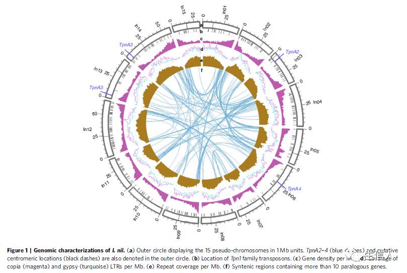 举个例子证明,作者在30条携带有端粒重复元件(AAACCCT)的scaffolds中检测到串联重复序列,其中13条因为完全由串联重复序列组成,而无法挂载到遗传图谱上。并且,作者在染色体2、6、8、14号的两端都检测到了串联重复序列,但在染色体3、4、5、9、10、12、13、15号中只在一端检测到。另外还发现18s、5.8s和25s都与串联重复区域中的NOR(nucleolar organizer regions)区域相关,但5s rDNA序列却离NOR区域很远。