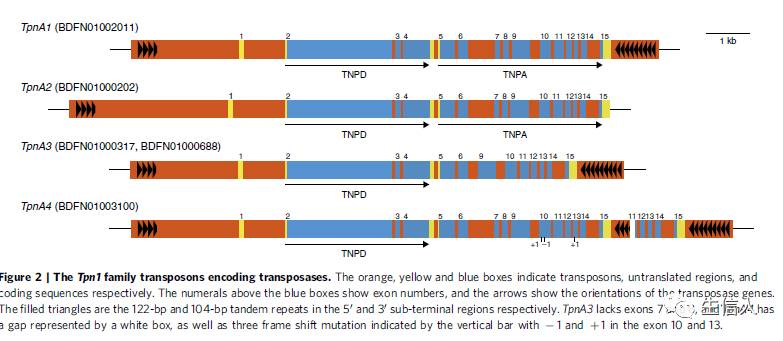 首先使用RepeatModeler预测重复序列,得出基因组重复序列含量为63.92%,其中LTR(长末端重复序列)占比最高。而LTR中,copia和gypsy元件分别占基因组的12.92%和14.46%。通过识别末端反向重复序列(terminal inverted repeat,TIR)和靶位点重复序列(target site duplication,TSD)检测到339个Tpn1家族的转座子。在这些转座子中,除了一个转座子含有的TSD序列是5 bp之外,其他全都只有3 bp。由BLAST比对结果显示,大部分Tpn1转座子在5’和3’末端区域都含有SRR序列。已知TIR和SRR是转座子转录的顺式调控元件(cis-requirements存在于DNA链上,对转录调控起作用;trans-不存在于DNA链,但与cis结合,对转录调控起作用的反式作用因子),那么可以推测Tpn1转座子很有可能是可以转座的。但同时发现32个Tpn1转座子的SRR区域中包含了大量重排,所以这些转座子也有可能已经失活了。有29个Tpn1转座子存在于基因的5’UTR和内含子区域,这有可能会干扰到基因功能。作者猜测Tpn1家族自发的转座子可能同时拥有TnpA和TnpD转座酶编码序列,如En/Spm。为了证实这个猜想,作者将玉米和金鱼草中的TnpA、TnpD序列与牵牛花中339个转座子序列BLAST比对,发现了两个与TnpD同源的转座子——TpnA3和TpnA4,但没有找到与TnpA的同源拷贝。在预测基因或转录本中也没有找到TnpA和TnpD对应的转录本序列,由此猜测转座酶在TKS株系中的转录是沉默的。在Q1072株系中Tpn1具有转录活性,并且存在与TnpA、TnpD同源的cDNA序列——TnpA1、TnpA2。因为TpnA1具有功能性的TIR和SRR序列,因此作者推测TpnA1是一个自发性转座元件,但并没有在该转座子中发现TpnA和TpnD的编码序列,也没有发现单独编码TpnA的序列。尽管在Tpn1转座子中没找到,但作者还是在基因组上分别找到了疑似TnpA和TnpD编码序列的同源拷贝,并且其转座酶的氨基酸序列十分保守,且与已知的En/Spm、金鱼草的Tam1转座酶拥有相同保守域。