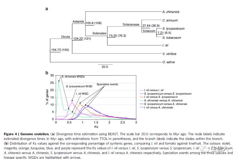利用MCScanX分析共线性,在2,275个共线性区块中找到了17,376对同源基因存在与于染色体上。牵牛花与番茄仅拥有47.05%的同源基因,而两者与猕猴桃的共线性基因却极为相近:34.89%和36.01%。作者猜测造成这种现象,可能是由于猕猴桃发生了两次近期的全基因组复制事件(whole genome duplication,WGD)导致的。茄科物种在7,100±1940万年前共同发生了一次近期的WGD事件。根据Ks分布图发现,番茄自身的WGD事件发生在番茄和牵牛花的WGD事件之后,猜测这可能也是茄科特有的WGD事件,也就是说发生时间在7,525万年前。同时,在牵牛花中也发现了一个Ks峰,作者猜测这可能是旋花科特有的WGD事件。与茄目中直系同源基因相比,旁系同源基因存在基因家族的扩张现象。对牵牛花特有的基因家族进行注释,发现其中富含与授粉、生殖过程相关的基因。