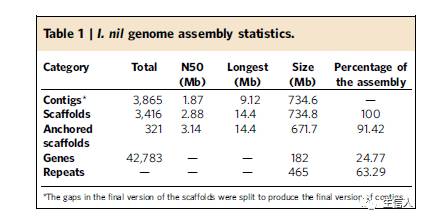 作者先通过流式细胞术评估确定基因组大小在750 Mb左右,再利用PacBio数据初步组装到contig水平,得到基因组大小为736.4 Mb,contigN50为1.83 Mb。将二代小文库与基因组比对,共检测到1,532个SNP,20,479个deletion和6,549个insertion,进而得出组装的单碱基准确率达到99.99%,看来组装效果还是不错哒~接着利用二代小文库数据对组装基因组进行纠错,并去除了长达1.15 Mb的线粒体和叶绿体序列。然后利用二代大文库数据进行scaffold搭建,并利用PacBio数据进行补洞,最终组装基因组的scaffoldN50达到3.72 Mb。作者还利用Soapdenovo2进行了组装,得到的基因组大小为1.1 Gb,而当只考虑1 kb以上的scaffolds和contigs时,基因组大小则为768 Mb,scaffoldN50为3.5 Mb,contigN50为9.5 kb。