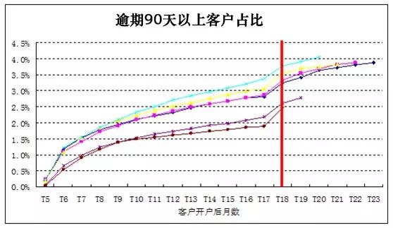 一般来说,vintage图形的横轴表示开户后的月数;纵轴表示若干天(如选择90天或120天,由于银行的帐单每月结算一次,因此vintage分析里的若干天通常都取30天的倍数)以上逾期客户的累积百分比,这里的逾期指拖欠银行不还款;图中的每一条曲线表示在同一个月审批进来的客户的逾期变化情况。如果曲线保持上升的趋势,表明逾期的客户还在增加,如果曲线保持水平的趋势,表明逾期的客户不再增加了。Vintage分析以曲线保持水平趋势需要的时间作为给客户定性的参考依据,这个时间段也称为观察窗口。
