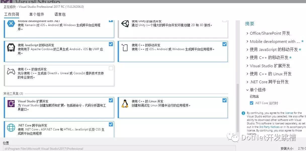 1、选择组件发生变化,不再跟以前一样可以默认安装,这样避免了全部安装后性能问题,这也是vs2017RC启动快的原因之一吧。