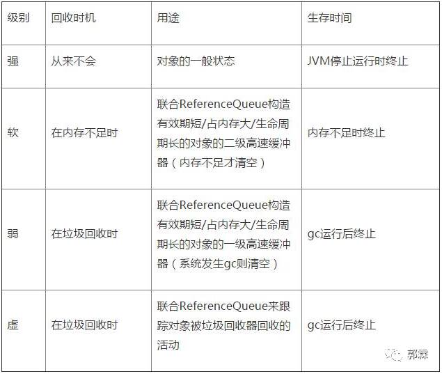 虚引用(PhantomReference):任何时候都可以被GC回收,当垃圾回收器准备回收一个对象时,如果发现它还有虚引用,就会在回收对象的内存之前,把这个虚引用加入到与之关联的引用队列中。程序可以通过判断引用队列中是否存在该对象的虚引用,来了解这个对象是否将要被回收。可以用来作为GC回收Object的标志。