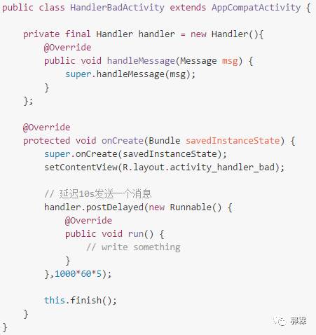 这个东西在我最近遇到的最多了,而它也是我们在内存泄漏中最为常见的,也许你的一个小忽略就会导致内存泄漏。在Android的新版本中,我们被要求必须把网络任务等耗时操作置于新线程来处理,我们通常会采用 Handler。