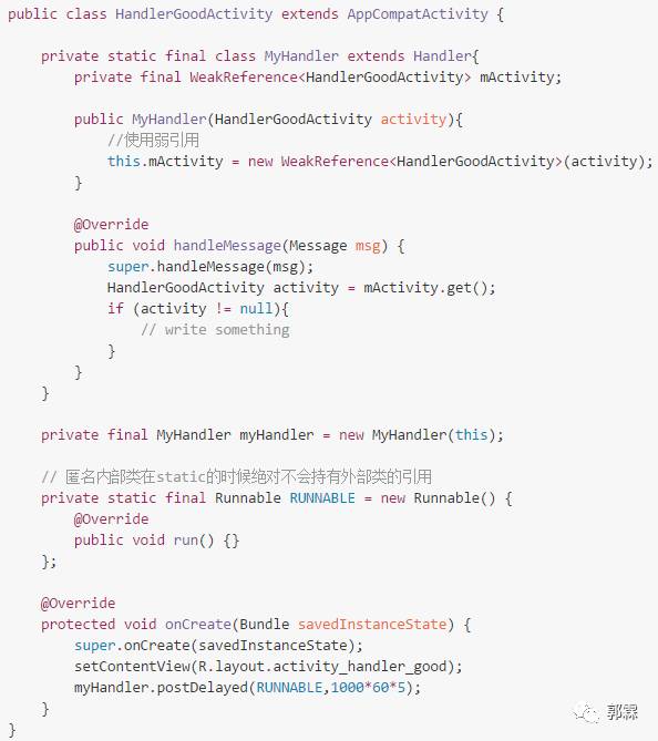 它们方便却暗藏杀机。Android开发经常会继承实现 Activity 或者 Fragment 或者 View。如果你使用了匿名类,而又被异步线程所引用,那得小心,如果没有任何措施同样会导致内存泄漏的: