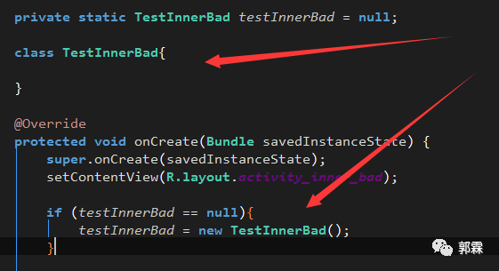 这样就在 Activity 内部创建了一个非静态内部类的单例,每次启动 Activity 时都会使用该单例的数据,这样虽然避免了资源的重复创建,不过这种写法却会造成内存泄漏,因为非静态内部类默认会持有外部类的引用,而该非静态内部类又创建了一个静态的实例,该实例的生命周期和应用的一样长,这就导致了该静态实例一直会持有该 Activity 的引用,导致 Activity 的内存资源不能正常回收。正确的做法为: