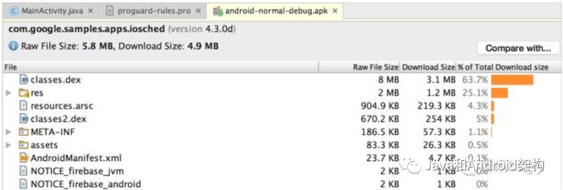 译注:通过查看各个目录或文件的大小,我们能发现APK中哪个区域的文件太大了,比如如果dex太大,我们是不是引入了重复功能的第三方库(比如Glide和Fresco),或者抽取出一个精简的第三方库(精简ffmpeg库);如果res目录太大,我们可以看看哪些图片过大了,需要通过tinypng压缩,或者用webp代替。