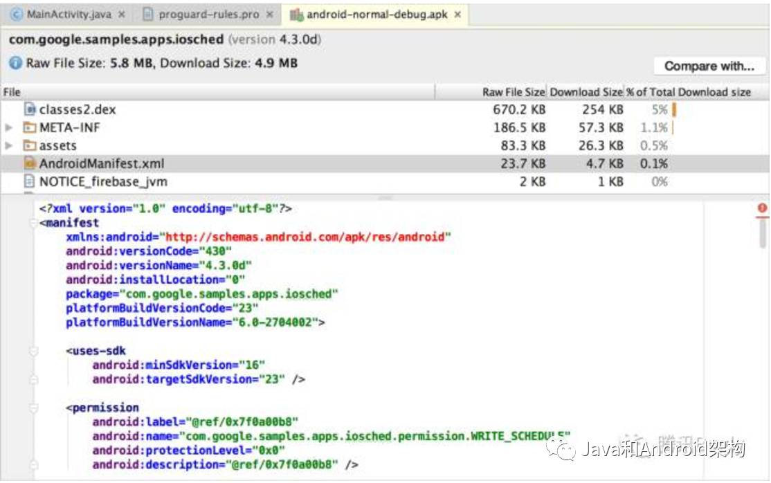 如果项目中包含了多个AndroidManifest.xml或者包含提供manifest文件的library,在APK中他们将被合并为一个manifest文件。在APK中manifest文件是普通的二进制文件,但是在APK Analyzer中查看manifest文件,该文件是以XML形式显示的。这种显示形式让我们能理解应用中的任何变化。比如,你能看到library中的AndroidManifest.xml是怎么合入最后的AndroidManifest.xml的。