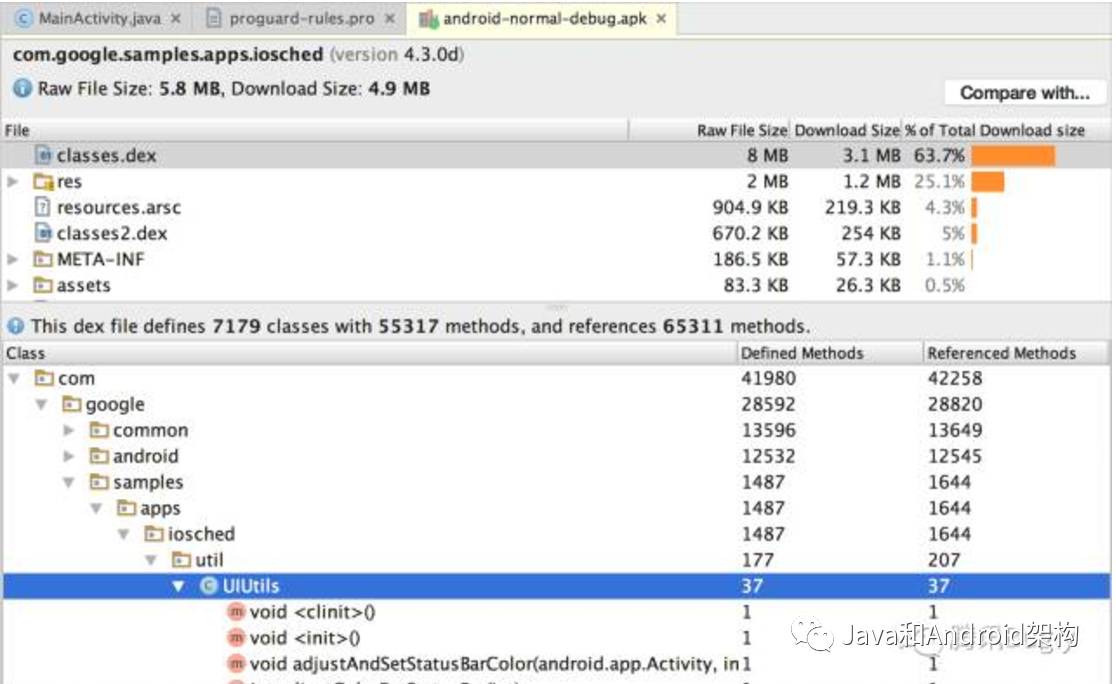 APK Analyzer的DEX文件浏览器让你能够快速了解DEX文件的信息。我们能看到类、包、总的引用和声明个数,这些信息能够帮助我们决定是否使用multi-dex或者移除依赖使得满足64K方法数限制。