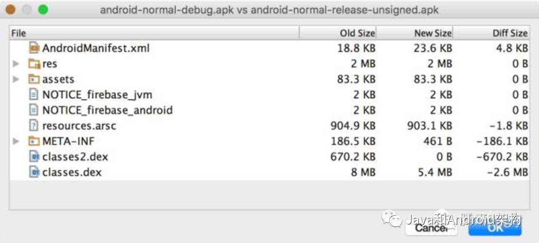 APK Analyzer能比较两个不同APK中各个实体的大小。这对于我们了解为何你的APP相比上个版本变大了是很有用的。
