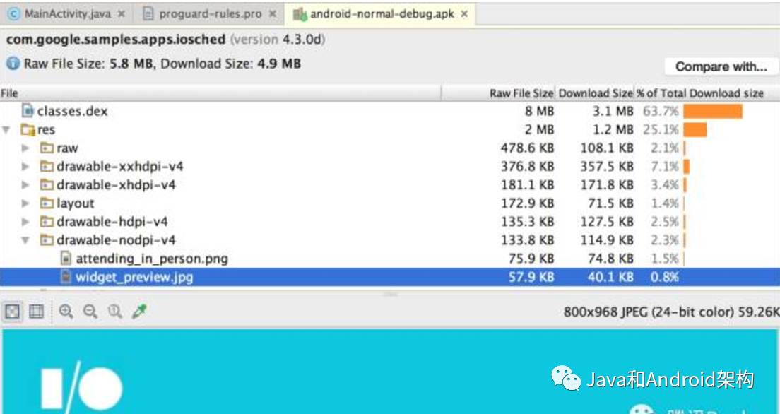 不同的构建任务会改变APK文件最后的实体。比如混淆压缩规则能改变你最后的代码和图片资源。在APK Analyzer中能够快速查看文件的最终版本:点击实体,就能在下面看到文件的内容,包含文字和图片实体的预览。