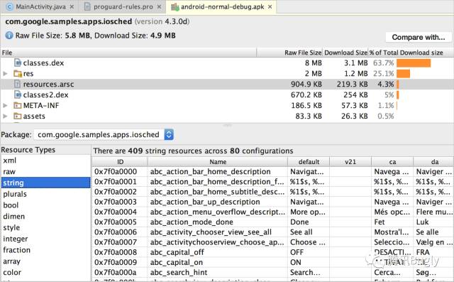 APK Analyzer也能展示文本或二进制文件。比如点击resources.arsc能够让你看到针对配置特定的值(例如一个字符串资源的特定语言的翻译)。如图4,你能看到每个字符串资源的翻译。