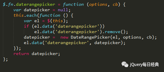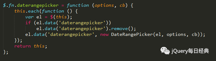 $.fn.这是在扩展 jQuery 对象,daterangepicker是扩展的一个方法,(对象方法中的this指向谁的问题同样参考上一篇文章)。this 指向 jQuery对象$("input[...]")。