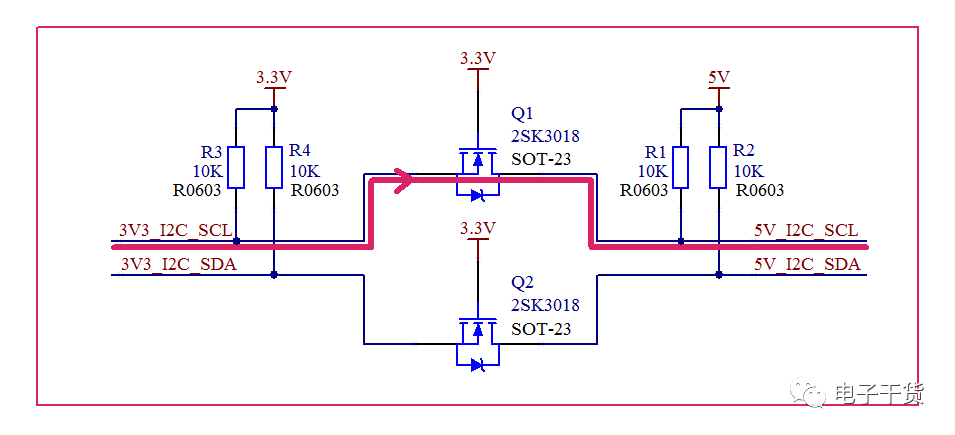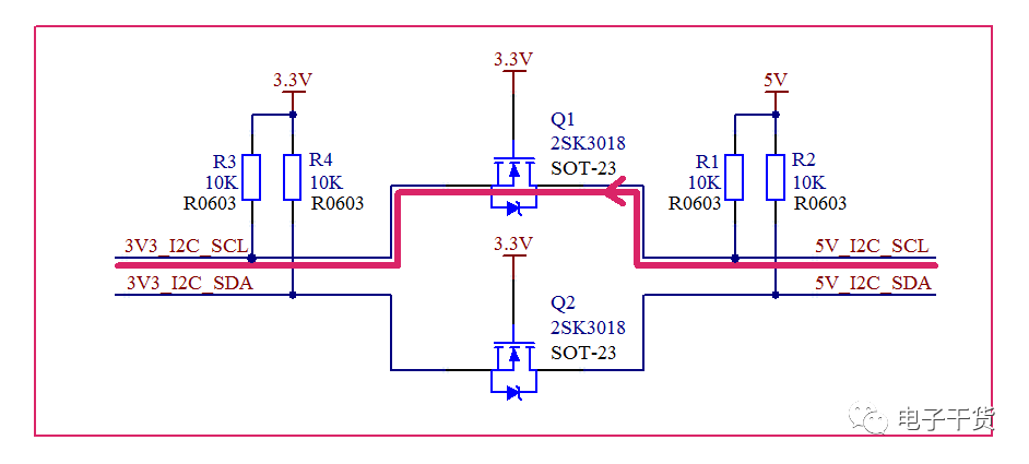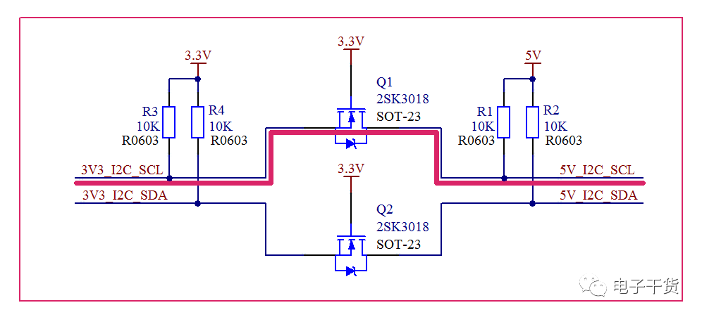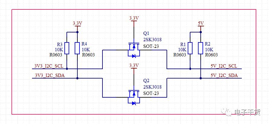 而本文主要阐述利用MOS管搭建的低成本方案,实现电平的双向转换,具体电路如下图示: