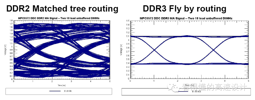 确实,这个要看情况。如果DDR3颗粒负载数量多的话(通常>4片),采用fly_by的拓扑结构信号质量总体会比T型结构好,但如果颗粒数量比较少(通常<4片),那么这2种拓扑的信号质量总体上就没有太大的差别,这个时候采用哪种拓扑就依个人所好了。下图三是同样接了18片颗粒的情况下最好信号的仿真眼图对比,采用fly_by的结果明显好于T型拓扑的结果。