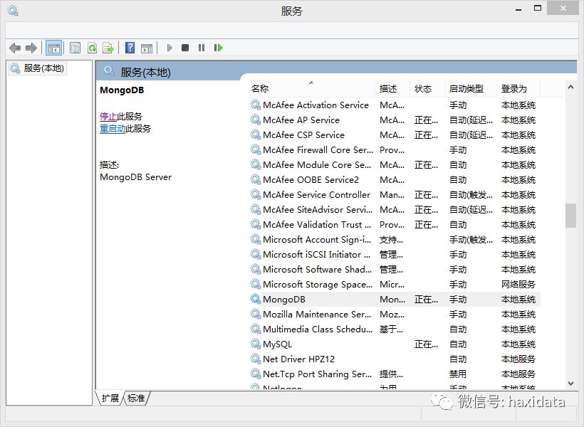 这便再次把MongoDB设置为Windows服务。此时在本地服务中就又可以看到MongoDB服务了。