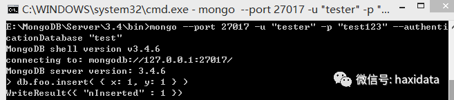 1.在mongod.exe文件位置打开命令窗口中运行如下命令:mongod --auth --port 27017 --dbpath D:\data\db