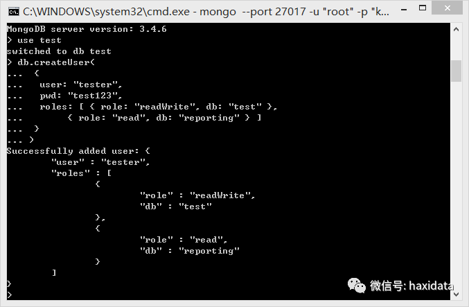 以下操作将用户tester添加到在test数据库中并给予test数据库的readWrite角色以及在reporting数据库中读取角色。
