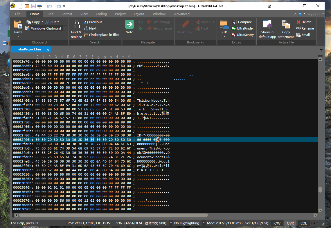 3、使用UltraEdit软件打开vbaProject.bin文件,并使用Ctrl+F打开查找对话框,输入id=,定位到需要修改的位置(动态演示如下);