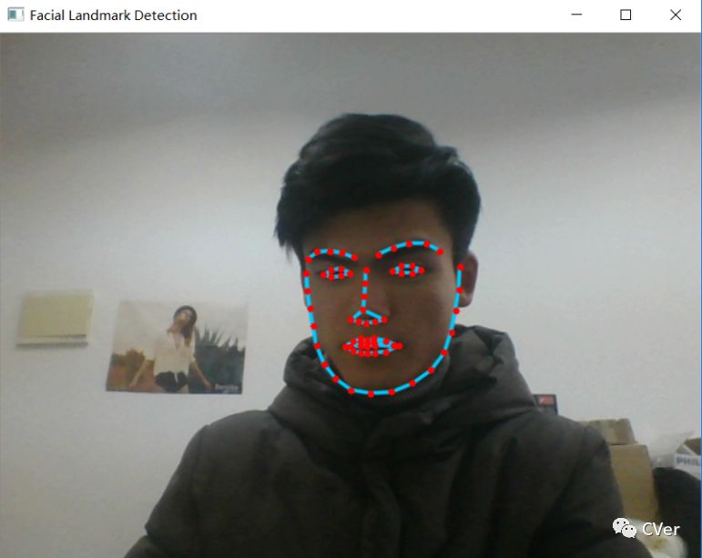 捕获视频帧并处理。我们既可以打开一个本地视频(.mp4),也可以打开网络摄像机(如果电脑有的话)来进行人脸关键点检测。