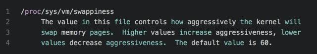 意思就是说这个值越高,越可能使用 swap 的方式回收内存,最大值为100,如果设为0,则尽可能使用回收 cache 的方式释放内存。
