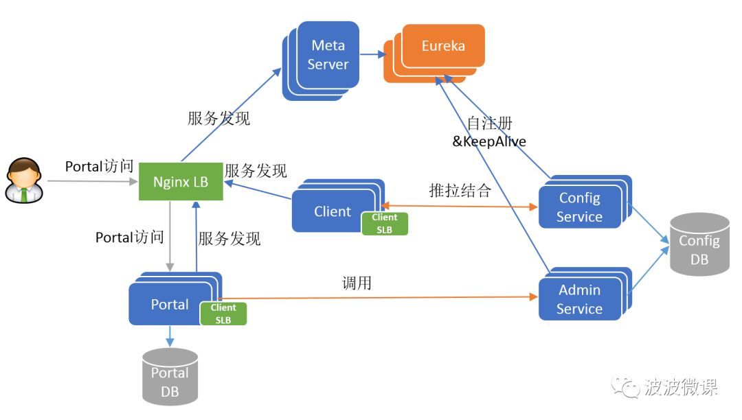 现在还有一个问题,MetaServer本身也是无状态以集群方式部署的,那么Client/Protal该如何发现MetaServer呢?一种传统的做法是借助硬件或者软件负载均衡器,例如在携程采用的是扩展后的NginxLB(也称Software Load Balancer),由运维为MetaServer集群配置一个域名,指向NginxLB集群,NginxLB再对MetaServer进行负载均衡和流量转发。Client/Portal通过域名+NginxLB间接访问MetaServer集群。