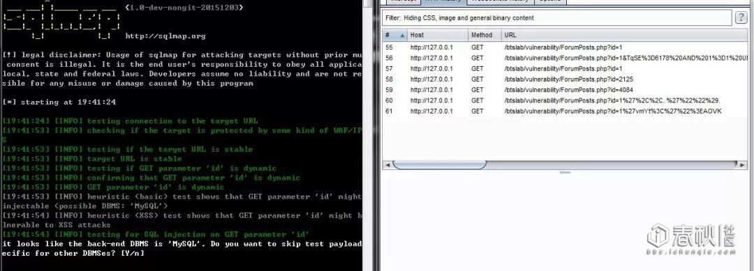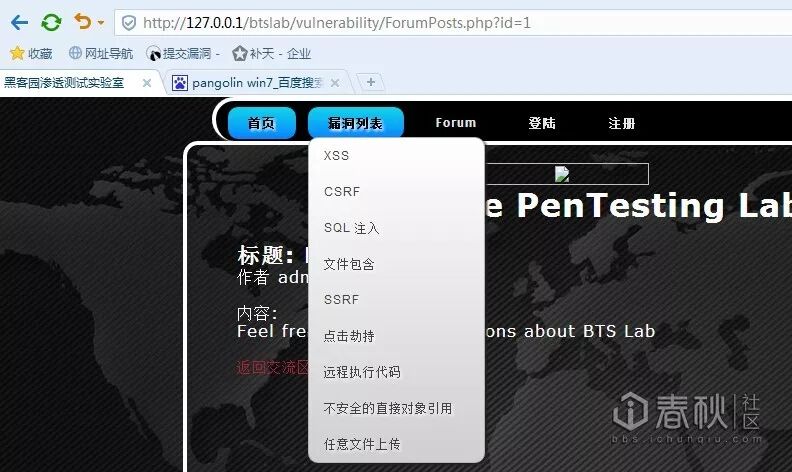 等一下,还没有注入点呢,怎么办?本地搭建一套渗透测试实验系统以协助注入点检测,这里用了“btslab渗透测试实验室”,大家也可以搭建DVWA等系统。