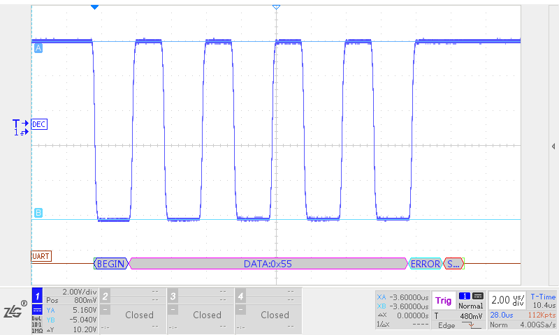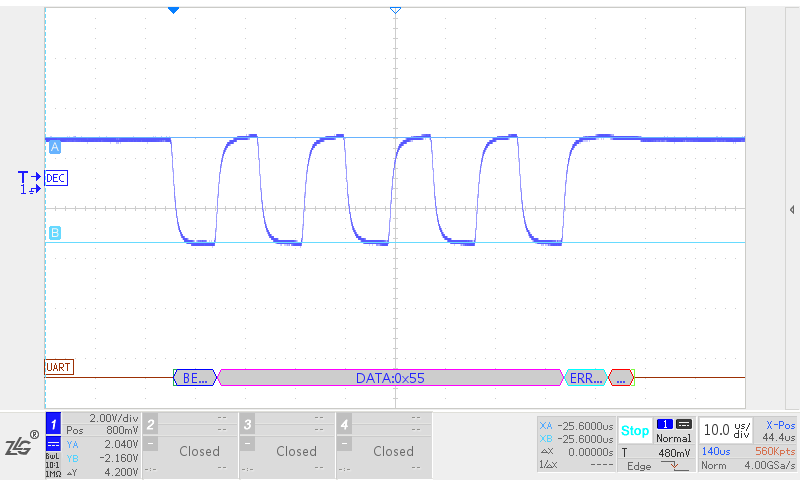 RS-485总线上的负载越大,RS-485收发器输出差分电压幅值越低,RSM485ECHT在5m,500kbps的情况下不加终端电阻和加终端电阻的波形如图3和图4所示,可以看出驱动信号在增加终端电阻后降低了2V左右。