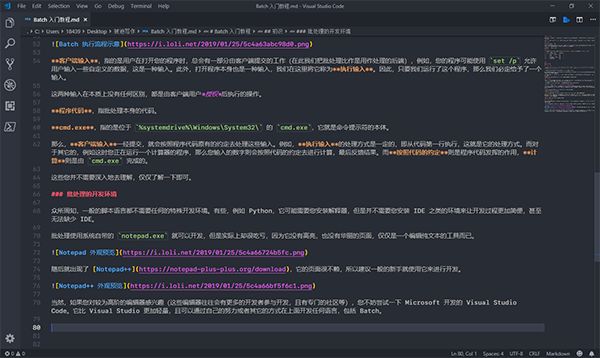当然,如果您对较为高阶的编辑器感兴趣(这些编辑器往往会有更多的开发者参与开发,且有专门的社区等),您不妨尝试一下Microsoft开发的Visual Studio Code。它比Visual Studio更加轻量(比Notepad++更重量),且可以通过自己的努力或者其它的方式在上面开发任何语言,包括Batch。