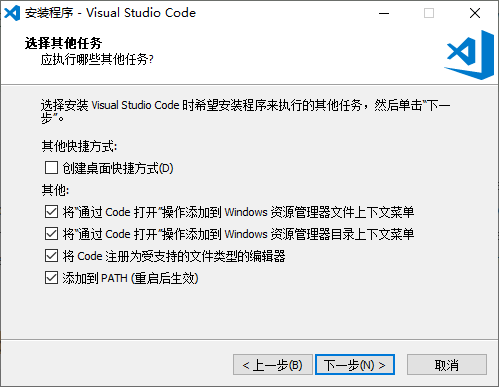 我推荐您勾选下面的四项,这四项勾选以后,您在以后编辑软件的时候会更加快速。如果勾选,当您右键选择一个可编辑文件的时候,会出现Open with Code选项,使用这个选项,可以快速使用Visual Studio Code打开选中文件。