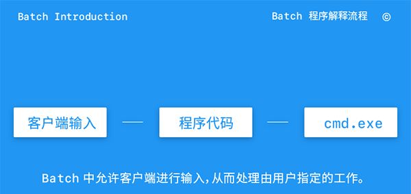 客户端输入,指的是用户在打开您的程序时,总会有一部分由客户端提交的工作(在此我们把批处理比作是用作处理的后端),例如,您的程序可能使用set /p允许用户输入一些自定义的数据,这是一种输入。此外,打开程序本身也是一种输入,我们在这里将它称为执行输入。因此,只要我们运行了这个程序,那么我们必定给予了一个输入。