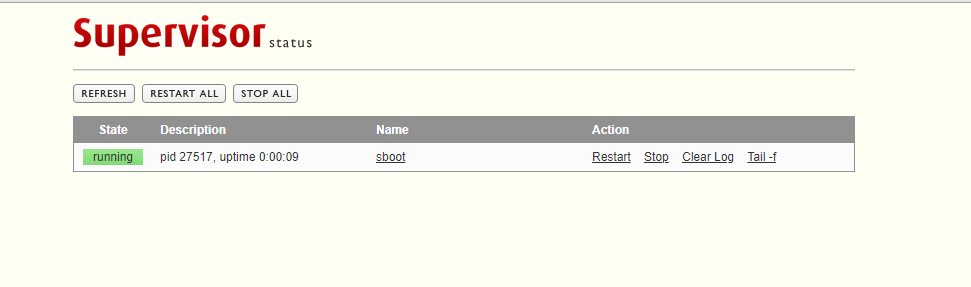 [root@wangzh supervisor.d]# supervisorctl sboot RUNNING pid 27517, uptime 0:18:04 supervisor>