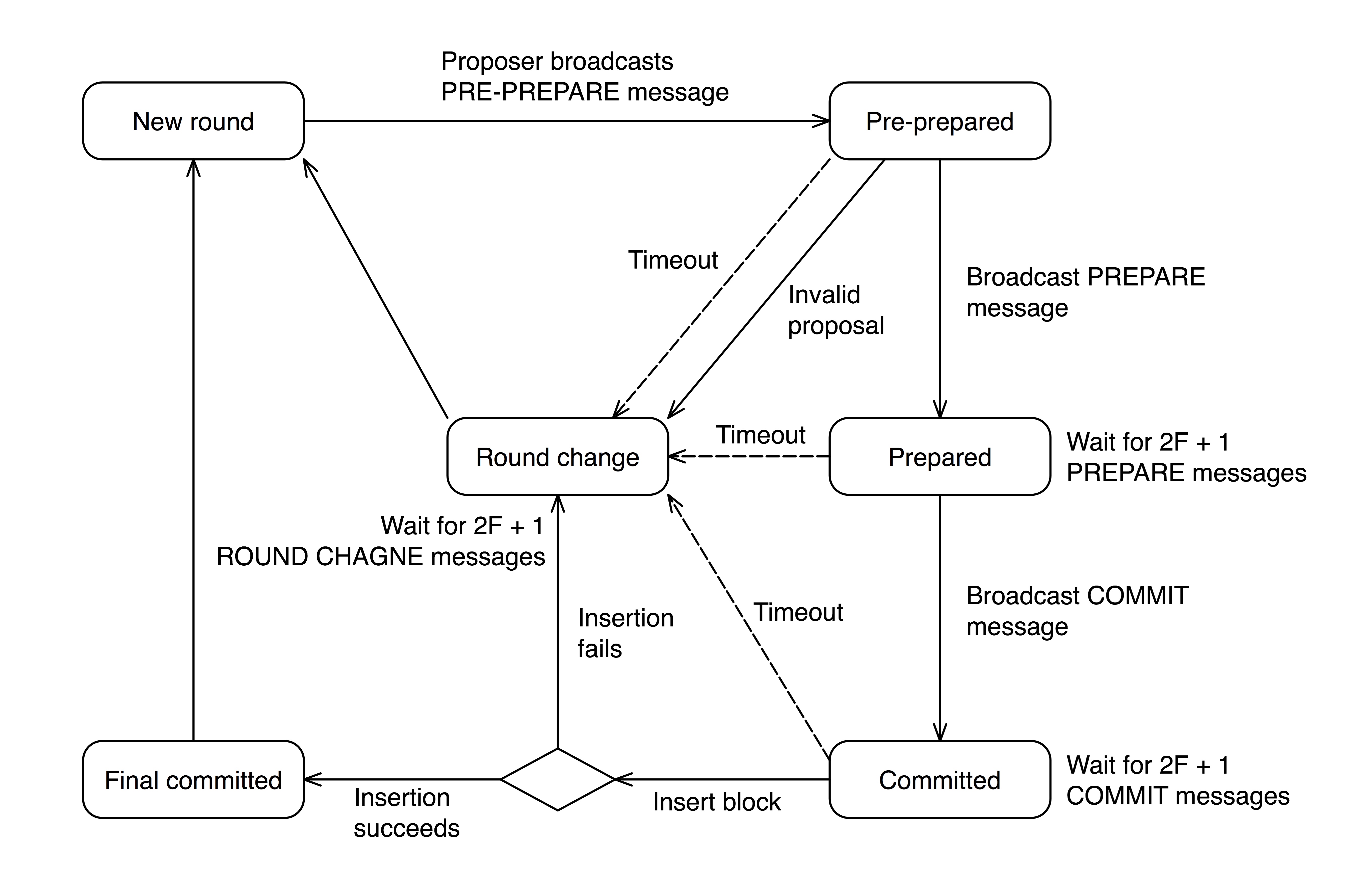 New Round: 一个proposer发送新的区块proposal。validator等待PRE-PREPARE信息。PRE-PREPARED: 一个validator已经收到PRE-PREPARE信息,并且广播PREPARE信息。然后等待2F + 1个PREPARE或者COMMIT信息。PREPARED: 一个validator已经收到2F + 1个PREPARE信息,此时把自身状态标记为PREPARED,并且广播COMMIT信息。然后等待2F + 1个COMMIT信息COMMITTED: 一个validator已经收到2F + 1个COMMIT信息,此时把自身状态标记为COMMITTED,并且开始把提出的block插入链中。FINAL COMMITTED: 一个validator已经成功把区块成功插入了链中,此时把自身状态标记为FINAL COMMITTED,并且等待下一轮。ROUND CHANGE: 一个validator等待关于同一个round下的2F + 1个ROUND CHANGE信息。