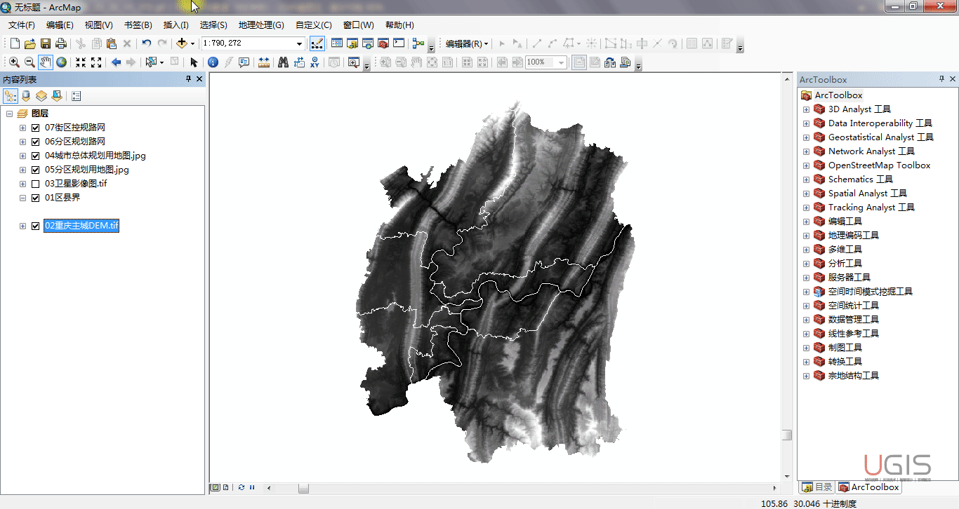 我们将数据全部添加进入ArcMAP,通过缩放至各要素图层并全部显示,可以发现部分要素能自动对齐,如主城区的行政边界、DEM及卫星影像能相互叠加对齐,通过CAD转换导入的分区及街区道路网也能相互自动对齐,但是和卫星影像等数据无法对齐,总规和分区规划的JPG文件则完全无法对齐。