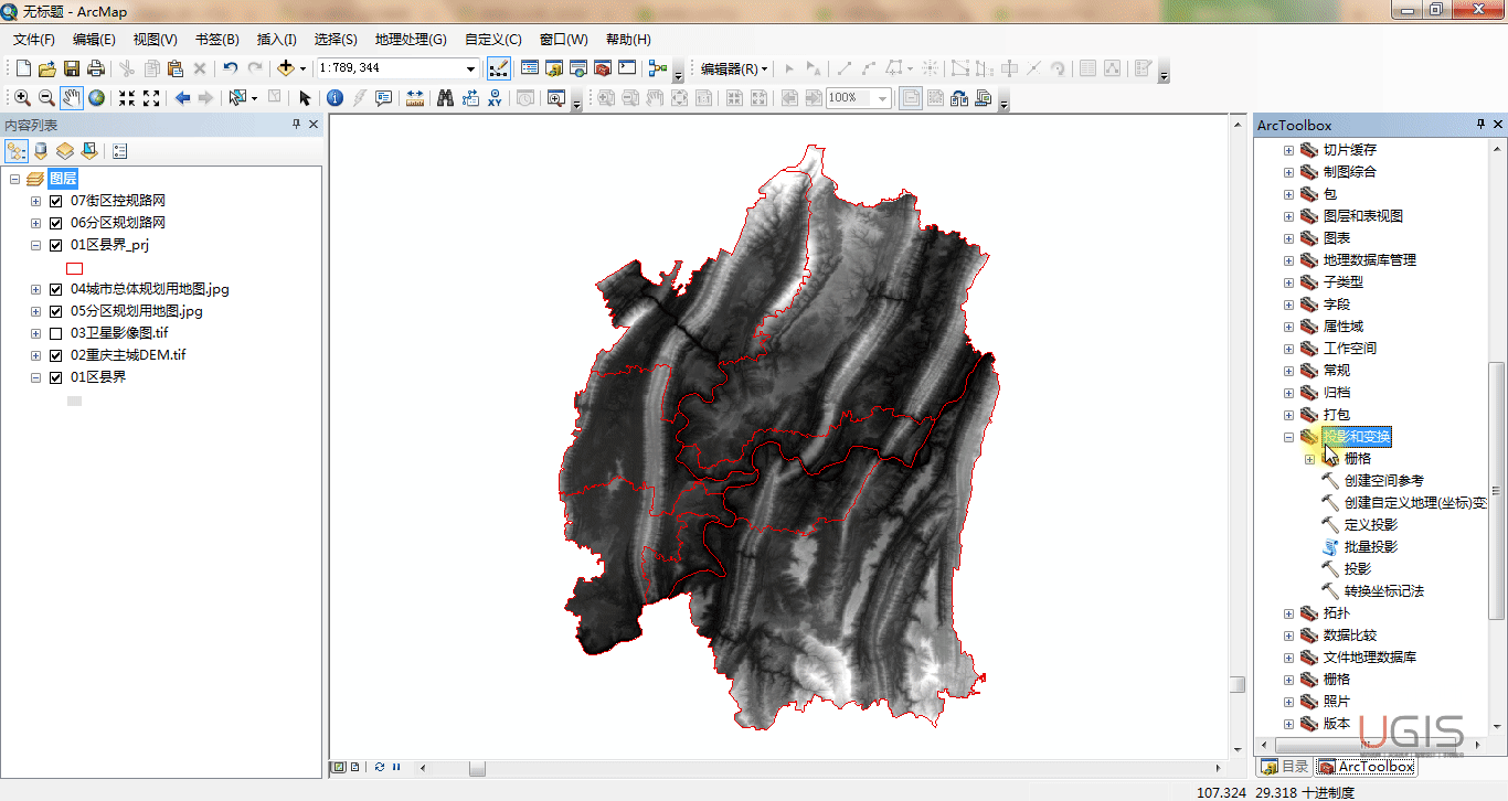 3.1 矢量数据的坐标系投影。如图所示,我们用“投影”工具对“01区县界”矢量数据进行投影。