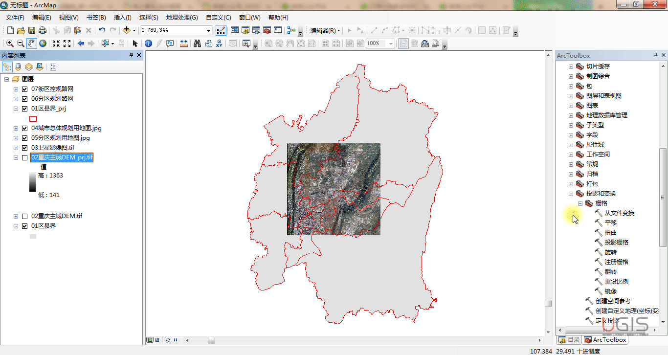 3.2 栅格数据的坐标系投影。如图所示,我们用“投影栅格”工具分别对“重庆主城DEM”和“卫星影像图”进行投影操作。